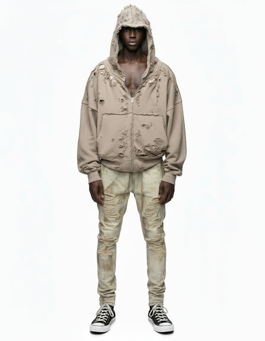 The Ellenvinis 1800GSM Double-Layer Washed Distressed Hoodie embodies high-street style and independent personality through exquisite craftsmanship.