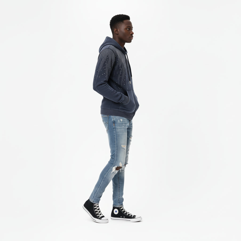 A statement diamond-cut zipper with crystal embellishment elevates this hoodie beyond a basic zip-up, blending luxury detail with raw streetwear attitude.
