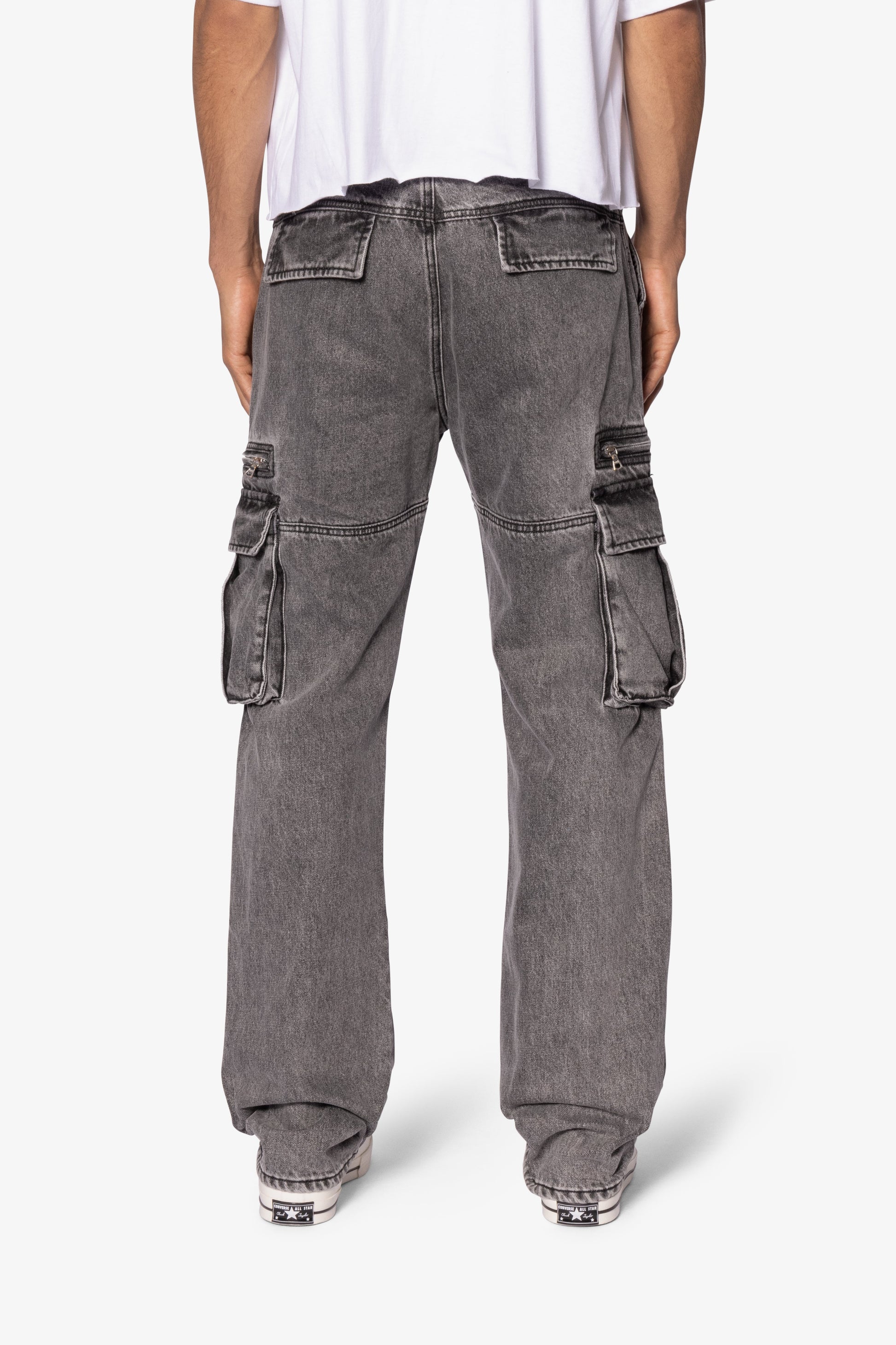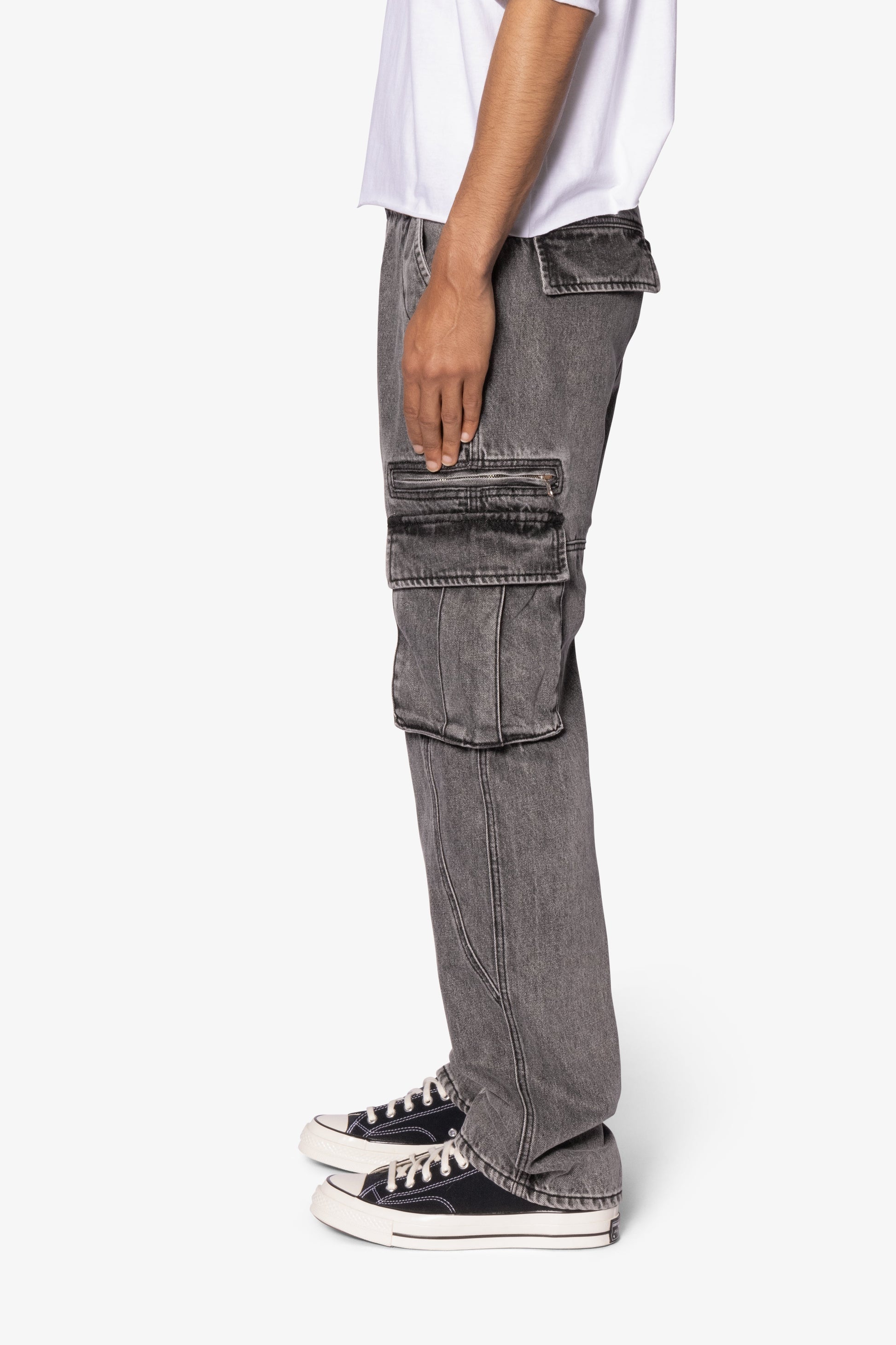 the V652 Owl Grey Cargo Pants is designed with our new V fit which is relaxed throughout and features a vintage washed black ddenim, cargo pockets at the outseam, panelling details throughout, and finished sanding throughout.