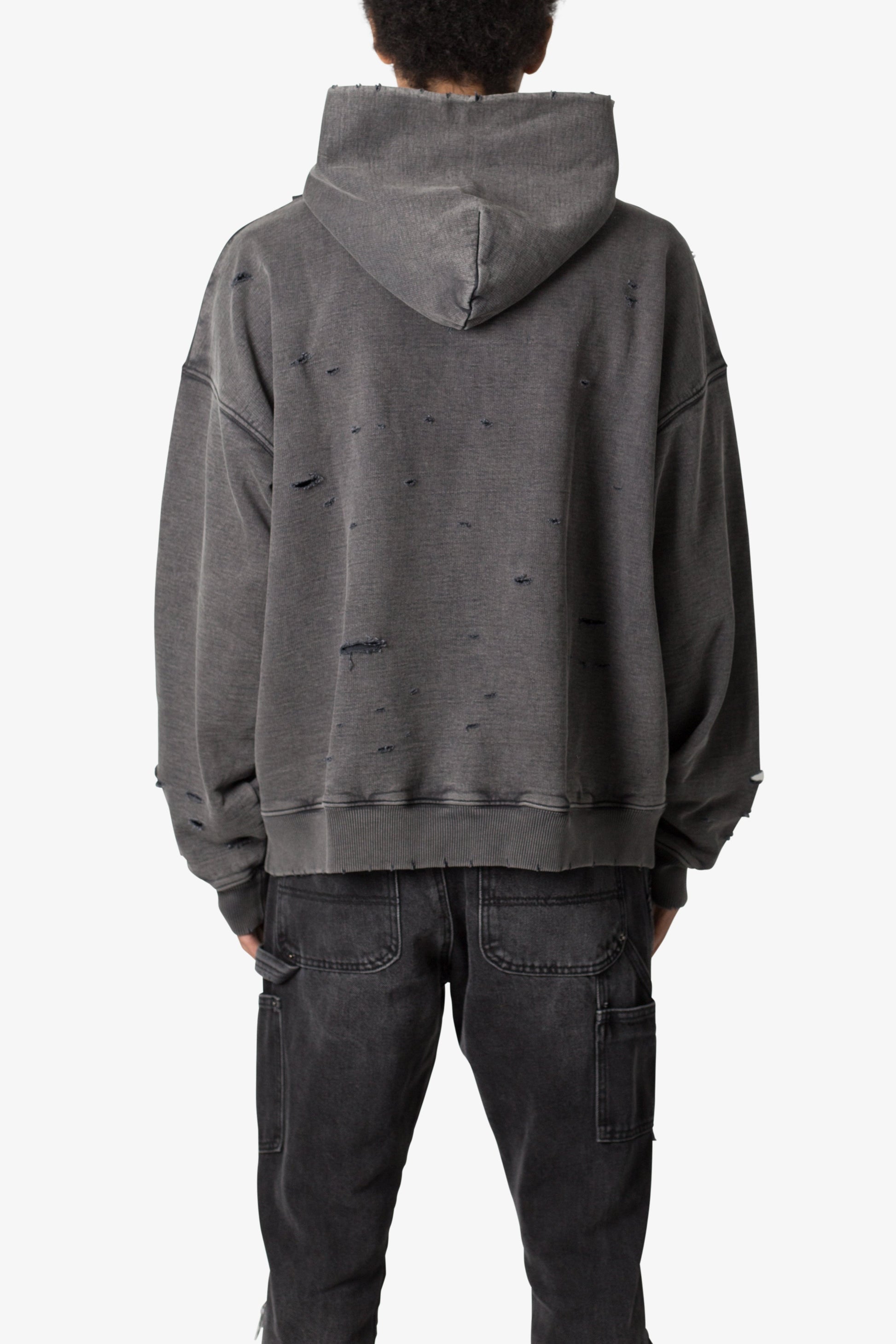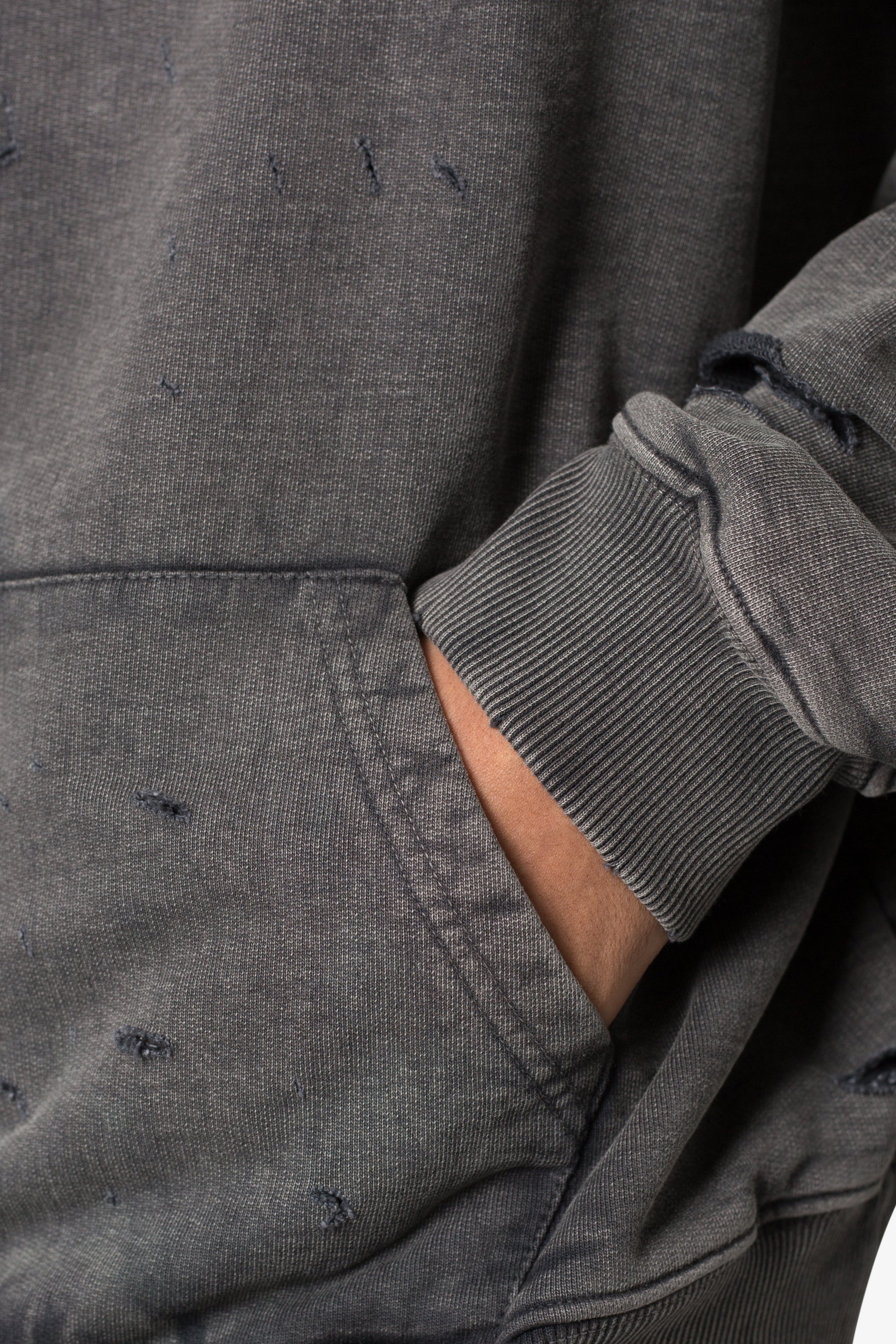 the Breeze Destroyed Hoodie is a baggy fit silhouette with a dropped shoulder that features an extreme vintage wash, distressing details throughout, and ripped collar detail